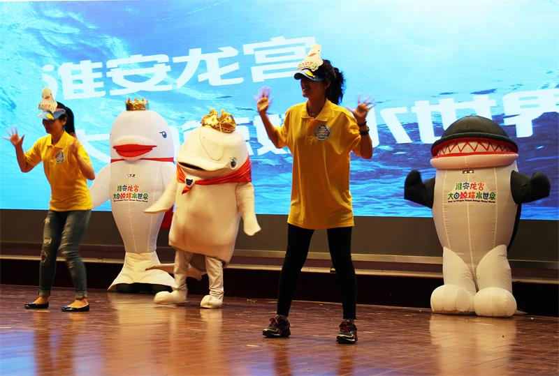 随着一阵音乐响起,十多位淮安西游集团的工作人员穿着卡通气模来到舞台上,为大家带来一场《白鲸妞妞舞》。《白鲸妞妞舞》是大白鲸世界儿童乐园的主题舞蹈,容易学习,在场的不少学生跟着手舞足蹈起来。